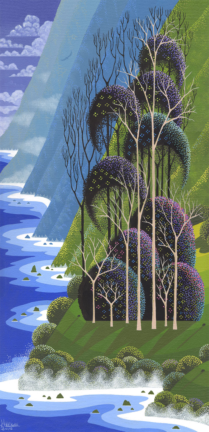 In case you haven’t noticed, I’ve taken a different direction with my paintings. It is my Big Sur series. And yes, for those who know his work, I am trying to channel the incredible Eyvind Earle. Someone asked me if I had studied with him. No, but I have studied his art.